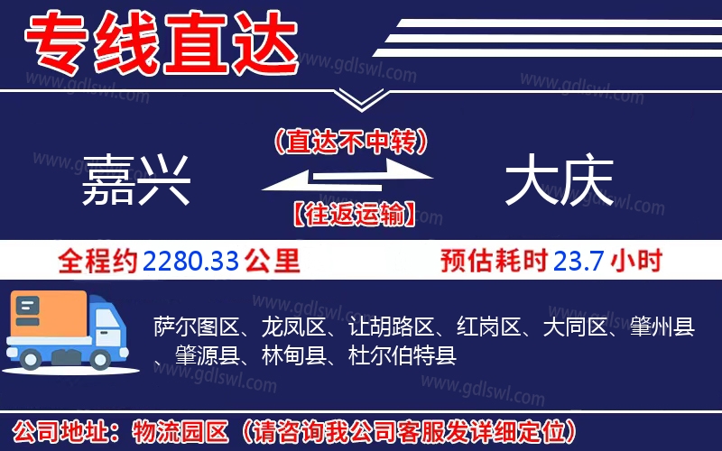 嘉興到大慶物流專線是一條連接嘉興和大慶的貨物運(yùn)輸線路,由陸順物流公司提供直達(dá)不中轉(zhuǎn)運(yùn)輸服務(wù),能為企業(yè)、工廠、貿(mào)易商以及個(gè)人提供高效、便捷、可靠的貨運(yùn)解決方案
