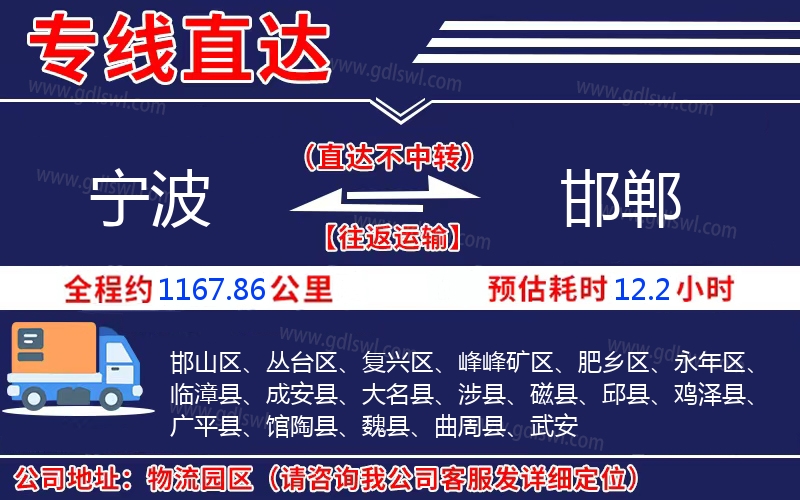 寧波到邯鄲物流專線是一條連接寧波和邯鄲的貨物運輸線路,由陸順物流公司提供直達(dá)不中轉(zhuǎn)運輸服務(wù),能為企業(yè)、工廠、貿(mào)易商以及個人提供高效、便捷、可靠的貨運解決方案