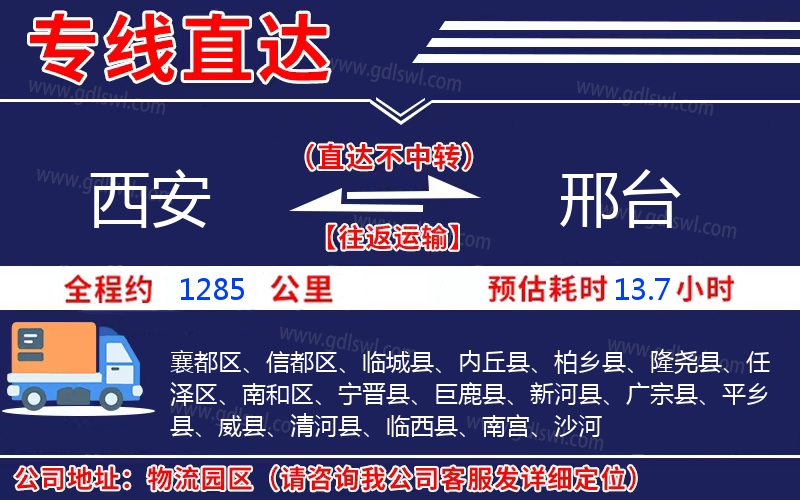 西安到邢臺物流專線是一條連接西安和邢臺的貨物運(yùn)輸線路,由陸順物流公司提供直達(dá)不中轉(zhuǎn)運(yùn)輸服務(wù),能為企業(yè)、工廠、貿(mào)易商以及個(gè)人提供高效、便捷、可靠的貨運(yùn)解決方案