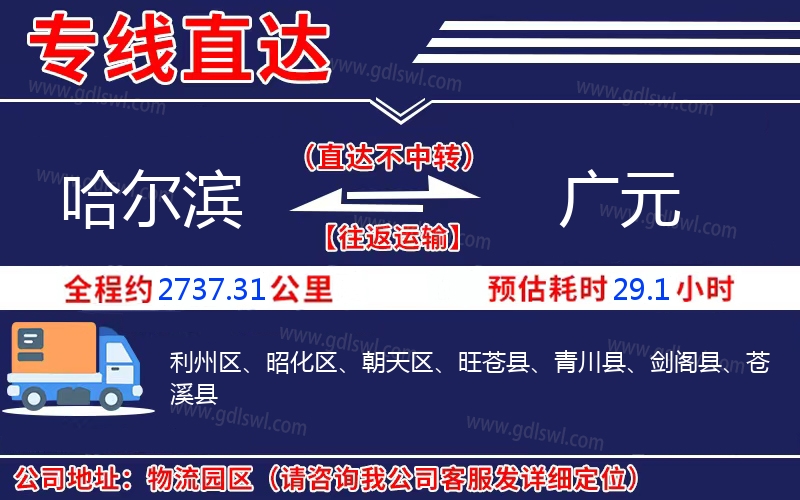 哈爾濱到廣元物流專線是一條連接哈爾濱和廣元的貨物運輸線路,由陸順物流公司提供直達不中轉(zhuǎn)運輸服務,能為企業(yè)、工廠、貿(mào)易商以及個人提供高效、便捷、可靠的貨運解決方案
