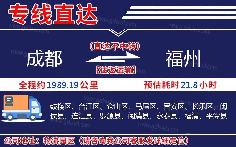 成都到福州物流專線是一條連接成都和福州的貨物運(yùn)輸線路,由陸順物流公司提供直達(dá)不中轉(zhuǎn)運(yùn)輸服務(wù),能為企業(yè)、工廠、貿(mào)易商以及個(gè)人提供高效、便捷、可靠的貨運(yùn)解決方案