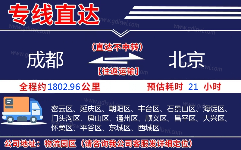 成都到北京物流專線是一條連接成都和北京的貨物運輸線路,由陸順物流公司提供直達不中轉運輸服務,能為企業(yè)、工廠、貿易商以及個人提供高效、便捷、可靠的貨運解決方案