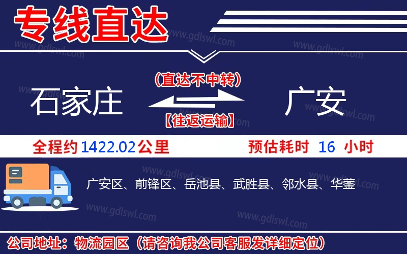 石家莊到廣安物流專線是一條連接石家莊和廣安的貨物運輸線路,由陸順物流公司提供直達不中轉(zhuǎn)運輸服務,能為企業(yè)、工廠、貿(mào)易商以及個人提供高效、便捷、可靠的貨運解決方案