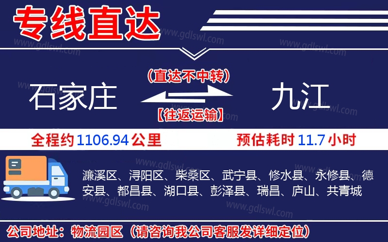 石家莊到九江物流專線是一條連接石家莊和九江的貨物運輸線路,由陸順物流公司提供直達不中轉(zhuǎn)運輸服務,能為企業(yè)、工廠、貿(mào)易商以及個人提供高效、便捷、可靠的貨運解決方案