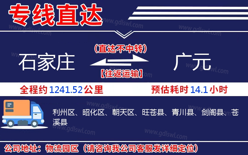 石家莊到廣元物流專線是一條連接石家莊和廣元的貨物運輸線路,由陸順物流公司提供直達不中轉(zhuǎn)運輸服務,能為企業(yè)、工廠、貿(mào)易商以及個人提供高效、便捷、可靠的貨運解決方案