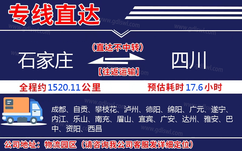 石家莊到四川物流專(zhuān)線(xiàn)是一條連接石家莊和四川的貨物運(yùn)輸線(xiàn)路,由陸順物流公司提供直達(dá)不中轉(zhuǎn)運(yùn)輸服務(wù),能為企業(yè)、工廠(chǎng)、貿(mào)易商以及個(gè)人提供高效、便捷、可靠的貨運(yùn)解決方案