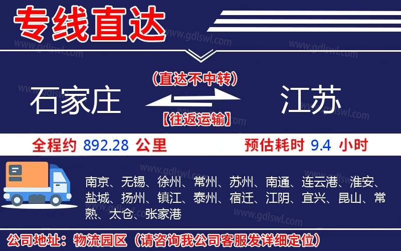 石家莊到江蘇物流專(zhuān)線(xiàn)是一條連接石家莊和江蘇的貨物運(yùn)輸線(xiàn)路,由陸順物流公司提供直達(dá)不中轉(zhuǎn)運(yùn)輸服務(wù),能為企業(yè)、工廠(chǎng)、貿(mào)易商以及個(gè)人提供高效、便捷、可靠的貨運(yùn)解決方案