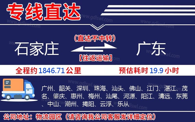 石家莊到廣東物流專(zhuān)線(xiàn)是一條連接石家莊和廣東的貨物運(yùn)輸線(xiàn)路,由陸順物流公司提供直達(dá)不中轉(zhuǎn)運(yùn)輸服務(wù),能為企業(yè)、工廠(chǎng)、貿(mào)易商以及個(gè)人提供高效、便捷、可靠的貨運(yùn)解決方案